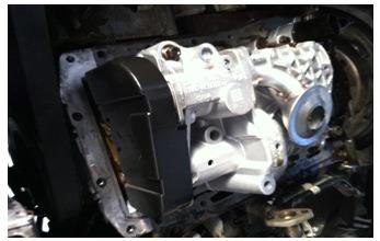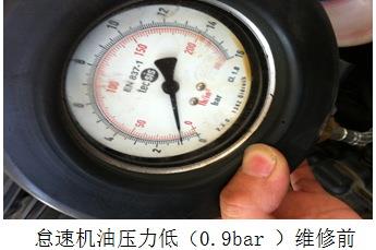 此車報修機油消耗過大,可拆檢發動機。經過檢查發動機外圍未見嚴重滲油現象,結合此發動機公里數初步判斷發動機內部磨損造成機油消耗過大,于是大修發動機。在大修完發動機后,檢測發動機機油壓力在怠速時油壓過低(著車后機油壓力從4bar直接降到2bar,熱車后降到0.9bar,正常值1.5bar左右,加速至2000轉后機油壓力顯示3.5bar,說明高怠速機油壓力正常)。