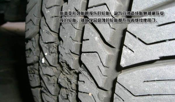 3、胎面變形或胎圈損傷的輪胎,缺氣行駛造成胎側被碾壓受損的輪胎,被化學品腐蝕的輪胎都不得再繼續使用了。