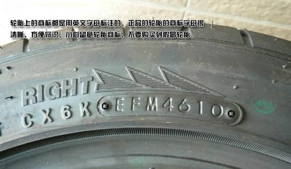 1、輪胎上的商標都是用英文字母標注的。正品的輪胎的商標字母很清晰,方便辯識。小心留意輪胎商標,不要購買到假冒輪胎。