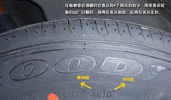2、在胎側靠近鋼圈的位置會有4個阿拉伯數字,用來表示輪胎的出廠日期的。前兩位表示周數,后兩位表示年份。比如“0814”就表示這個輪胎的出廠日期是在2014年第8周。