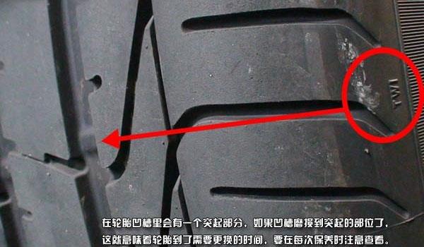 4、在輪胎凹槽里會有一個突起部分,如果凹槽磨損到突起的部位了,這就意味著輪胎到了需要更換的時間,要在每次保養時注意查看。