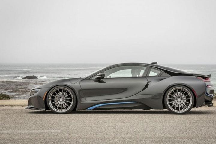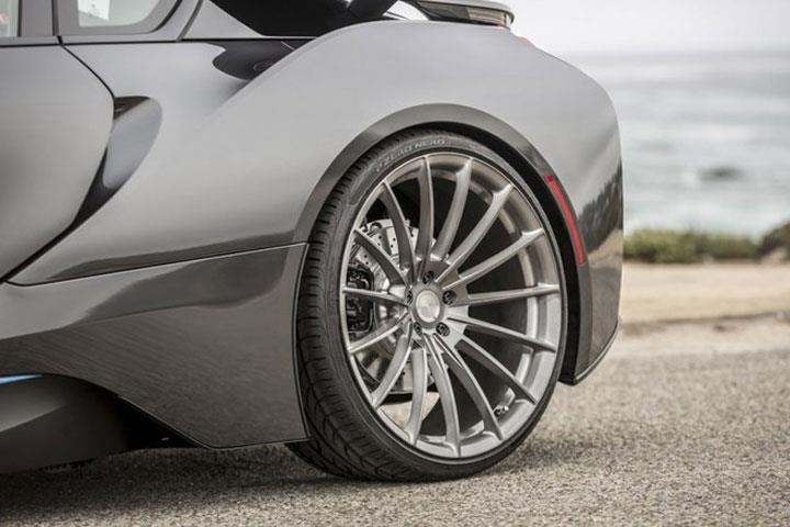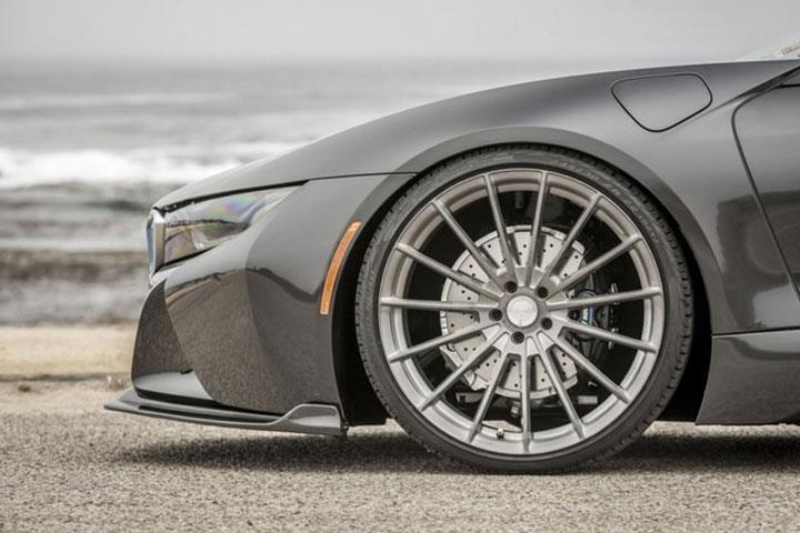 改裝還包括新的V-FE 402鍛造車輪。 由T-6061鍛造鋁合金制成,這些15輻輪提供了令人難以置信的強度,同時將重量降至最低,真正的高性能解決方案。 不僅減輕了輪轂的重量,提高了整體性能,而且減少了燃油消耗 - 這無疑增加了寶馬i8的魅力。