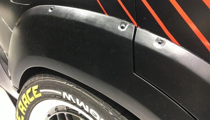 車身側面的輪眉還加裝了寬體套件和側裙,讓這輛車看起來更加魁梧,再加上新換裝的輪胎和輪圈,這輛車已經到了“武裝戰車”級別。
